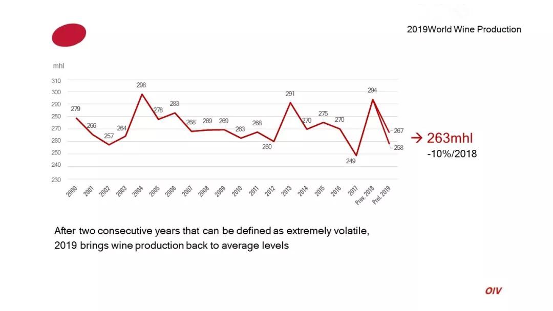 據國際葡萄與葡萄酒組織(OIV)最新數據顯示,2019年全球葡萄酒產量*為263億升(mhl),同比2018年下降了10.54%。包括法國、意大利、西班牙在內的葡萄酒主產國產量均有不同程度下降。