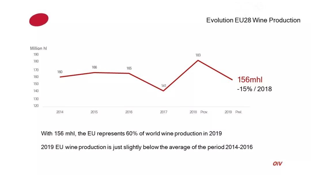 歐盟國家2019年葡萄酒產量156億升(mhl),占據全球葡萄酒產量的60%,略低于2014-2016年平均水平。