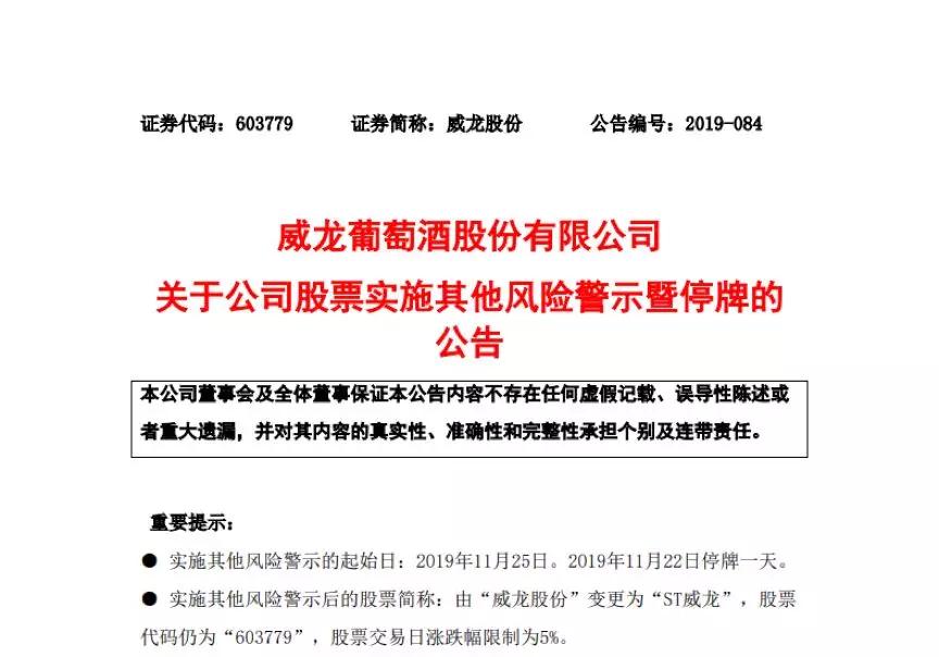 威龍股份發(fā)布公告稱,公司控股股東、實(shí)際控制人、董事長王珍海擅自以上市公司名義對(duì)外提供擔(dān)保,公司股票實(shí)施其他風(fēng)險(xiǎn)警示,2019年11月22日停牌一天。股票簡稱由“威龍股份”變更為“ST威龍”,股票代碼仍為“603779”,股票交易日漲跌幅也從10%限制為5%。