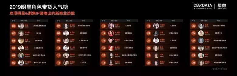 最近首屆互聯(lián)網(wǎng)影視文娛盛典推出的號(hào)稱國內(nèi)首份基于真實(shí)消費(fèi)數(shù)據(jù)的角色帶貨力榜單“2019明星角色帶貨人氣榜”。