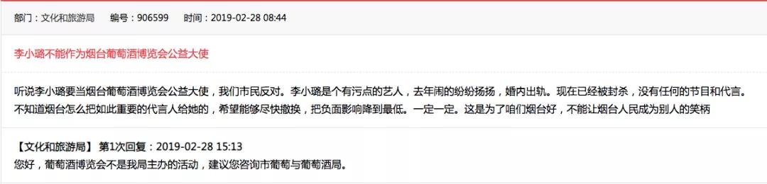 無獨(dú)有偶,今年初,煙臺(tái)國際葡萄酒博覽會(huì)想推陳出新,于是邀請(qǐng)李小璐擔(dān)任第十二屆煙臺(tái)國際葡萄酒博覽會(huì)的公益大使,希望“李小璐將利用她在巨大的粉絲影響力在中國全力推廣煙臺(tái)酒博會(huì)。”