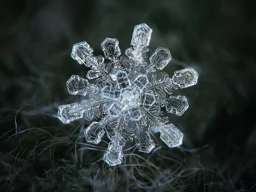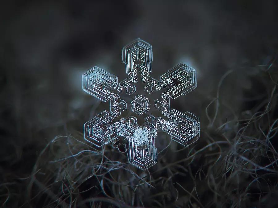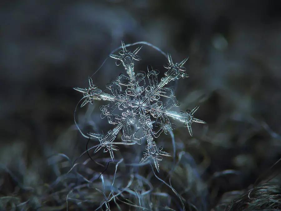 在他的微距鏡頭下,紛紛揚揚的一場場雪被“拆碎”,形態各異的冰晶呈現出各式形狀規整、樣式精美的圖案,在讓人沉迷于雪花無限美麗與夢幻的同時,亦讓人不禁贊嘆大自然的神奇。