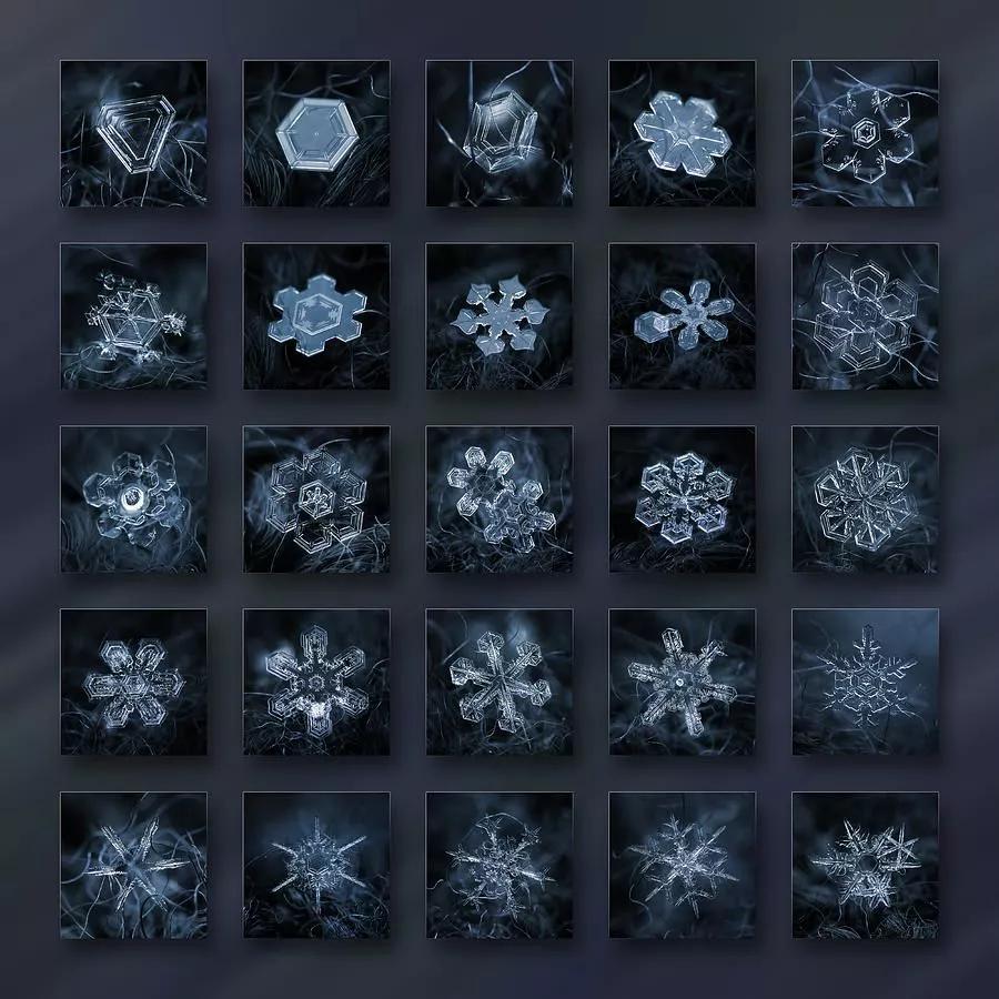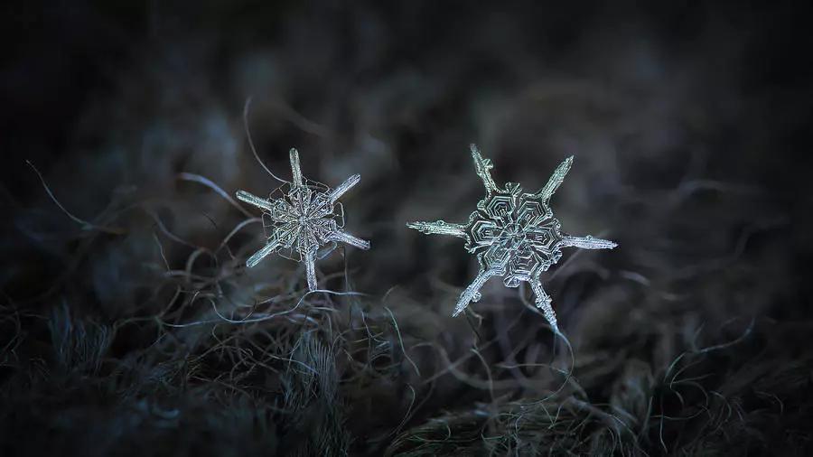 經過多次嘗試后,克拉托夫最后采用了兩種辦法拍攝,一種是讓雪花落在深色的羊毛織物上,混合著渾濁天空下的自然光拍攝;另一種是使用 LED 燈作為輔助工具,逆光拍攝宛若水晶一般的雪花。