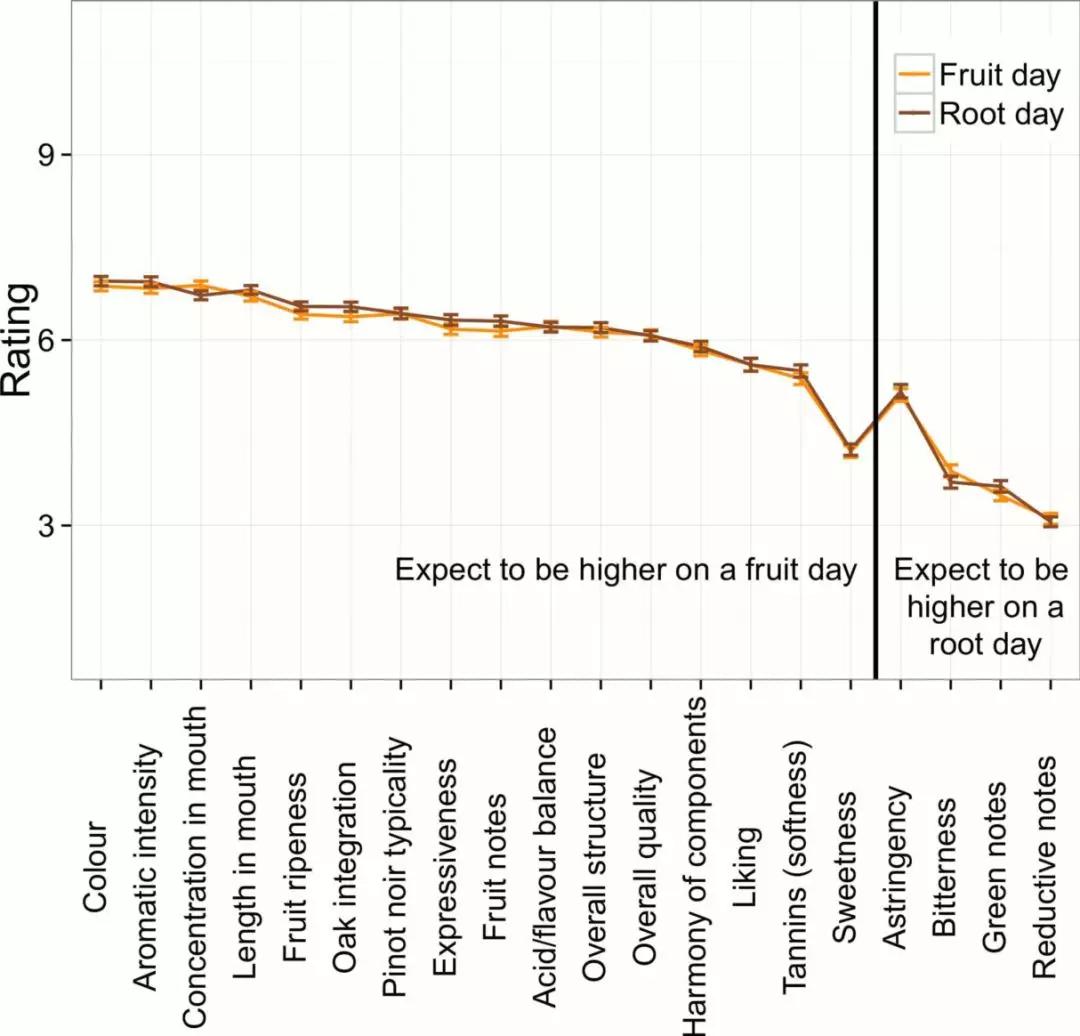 出乎意料的是,實(shí)驗(yàn)顯示:一直以來被認(rèn)為會對葡萄酒消費(fèi)者品飲體驗(yàn)帶來巨大影響和指導(dǎo)意義的日歷,并未對任何一款酒系統(tǒng)性地產(chǎn)生了影響。