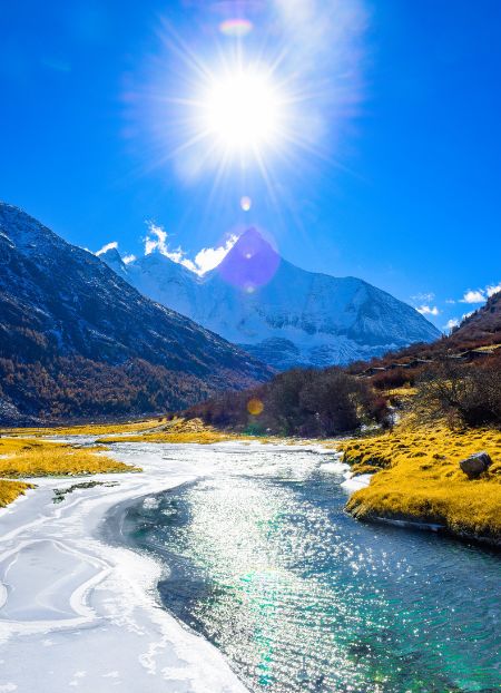 央邁勇雪山是稻城景區(qū)中著名的三座神山之一,它的海拔最高,終年積雪不化。草甸盡頭一座雪山拔地而起,直刺藍天。