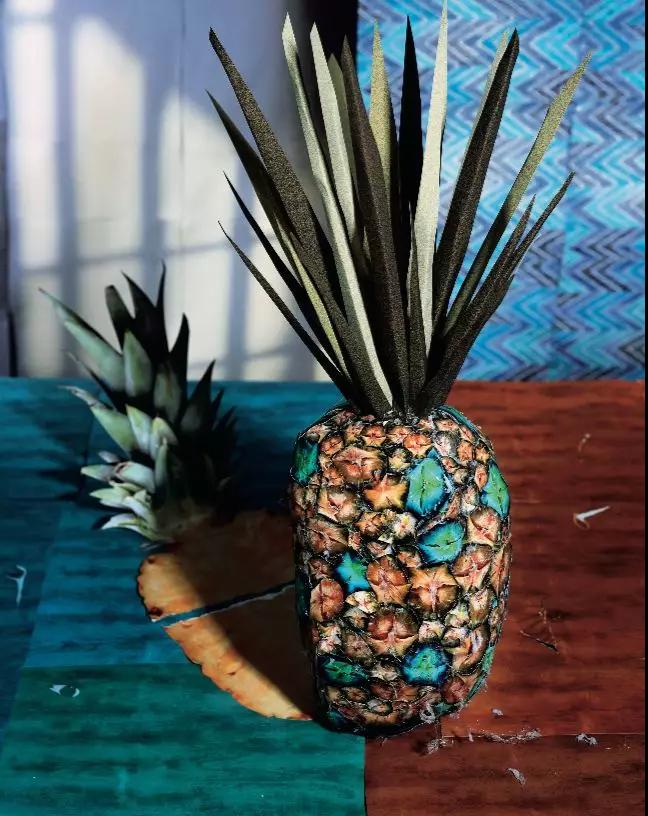 組成“靜物”的絕大部分食物都是水果,甚至還有用紙殼打印的假菠蘿——丹尼爾·戈登(Daniel Gordon) 的《菠蘿和影子》 (Pineapple and Shadow, 2011),如果僅以它們作為食物,好像可以直接加入果食主義者(Fruitarian)的行列了。直到這一面面深藍(lán)背景展墻的水果盛宴快要結(jié)束之時(shí),才出現(xiàn)了少許葷食。