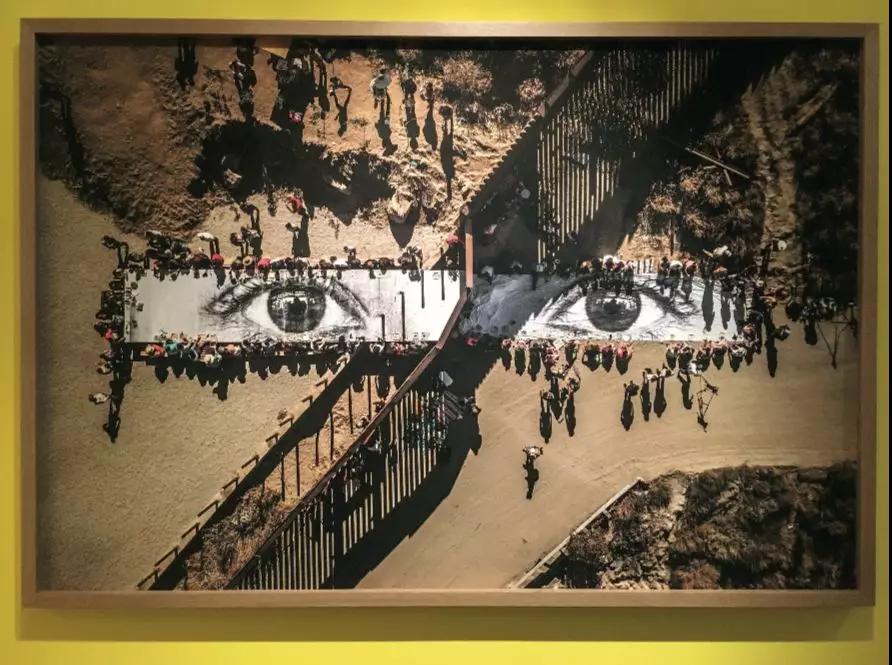 這種平靜馬上被接下來的作品打破。法國藝術(shù)家JR在 2017 年拍攝于美國與墨西哥邊境的作品《移民,梅拉,穿越邊境的野餐》(Migrants, Mayra, Picnic Across the Border)直接以一雙眼睛和觀眾對視。照片從空中俯拍,應(yīng)該由無人機(jī)完成,細(xì)看之下,這雙眼睛印在一張有兩種形態(tài)的餐桌上,一種是堅(jiān)硬的桌子,另一種是柔軟的桌布。桌子和桌布并未真正相接,但因?yàn)橐曈X和情感上的慣性,把它們看作是一張穿越了邊境的餐桌。與這張餐桌對視,有那么一刻,可以忽視墻的阻隔,只看見這些同吃同喝的人們。