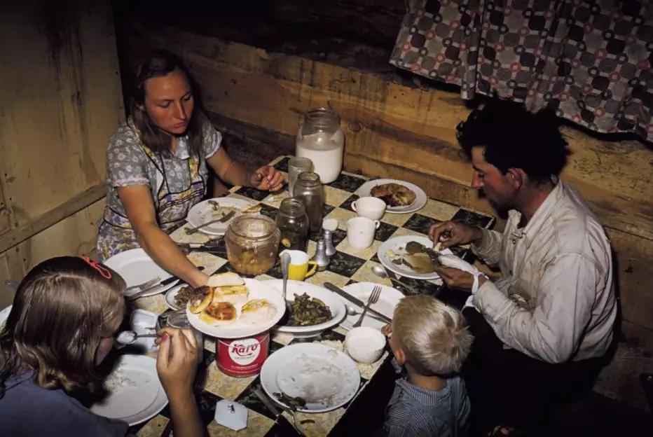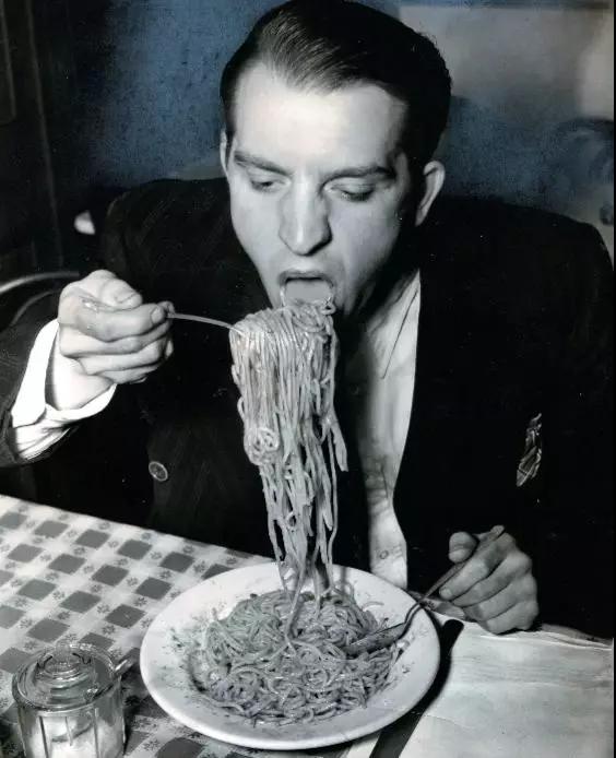比如,維吉(Weegee)拍攝的《菲利普·斯塔佐在 WPA 上享受他最喜歡的食物,因?yàn)樗犝f軍隊(duì)不太喜歡供應(yīng)意大利面》(Phillip J. Stazzone is on WPA and enjoys his favourite food as he'sheard that the Army doesn't go in very strong for serving spaghetti. 1940)以他慣常的戲劇化表達(dá)讓一副普通境界的吃相躍然紙上。維吉鏡頭下的美國在 1940年尚有一盤意大利面,拉塞爾·李(Russell Lee)在同一年份走入美國新墨西哥州的鄉(xiāng)下,便還能看見大蕭條最后的尾聲:小城市普通美國家庭并不豐盛的晚餐。20年后,同樣在美國,食物上的局促有了很大改觀,但更直觀的窘境達(dá)到了高峰: 種族問題。佚名攝影師拍下的《午餐吧臺的罷工》(Lunch Counter Sit-in) 即顯示了這個(gè)問題。兩名美國黑人大學(xué)生在“只準(zhǔn)白人” (whites-only)的餐廳吧臺上學(xué)習(xí),兩名白人女服務(wù)員在觀望他們的同時(shí)拒絕為他們服務(wù)。冰冷拒絕且?guī)猓欠浅<兇獾某鸷薇砬椤K膫€(gè)人,圍桌,卻沒有可供享用的食物。種族主義作為曾經(jīng)橫亙在他們之間無形的高墻,直到今天都還有殘?jiān)珨啾诹舸妫癁榈桶慕O腳石。