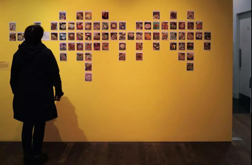 《減肥者食譜卡片》(Weight Watchers Recipe Cards, 1974)幾乎鋪滿了一整面墻。這面墻也最受觀眾歡迎,明黃底色之下,滿墻各式各樣的食物,引發(fā)熱烈討論,時(shí)而歡聲笑語,熱鬧若市,引得剛?cè)雸龅挠^眾側(cè)目。粗看之下,這就是一墻食物,細(xì)細(xì)看來往往都要吸幾口涼氣:這些食物在外形上都有超越常規(guī)審美的模樣,大多濃厚濁膩,用“黑暗料理”形容不為過,有的甚至算得上“邪典料理”……目的何在?——《減肥者食譜卡片》。理論上,減肥需要控制飲食并加強(qiáng)鍛煉,控制飲食的方法不少,遏制食欲無疑能從源頭上解決問題。于是,這些有助于遏制食欲的小卡片應(yīng)運(yùn)而生,可謂“一本正經(jīng)胡說八道”,難怪觀眾會(huì)邊看邊笑。