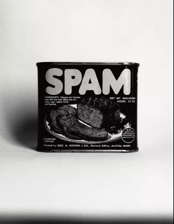 杜瓦諾讓畢加索與面包嬉戲后,另一位波普藝術(shù)家登場。艾德·魯沙(Ed Ruscha) 的《斯帕姆午餐肉》(Spam, 1961)與安迪·沃霍爾的《金寶湯罐頭》(Campbell's Soup Can, 1962)有異曲同工之妙。去掉顏色的午餐肉好像還顯出一絲正色,不像它代表的快餐文化那樣輕浮。