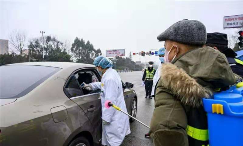 1月28日,四川省成都市龍泉驛區,為了嚴防成都的過界入城車輛的疫情,龍泉驛區大面鎮醫院、錦江區醫院聯合公安、防疫、執法等部門冒雨嚴防死守,檢查出入車輛及司乘人員,并對進城車輛消毒,對人員檢測登記體溫。