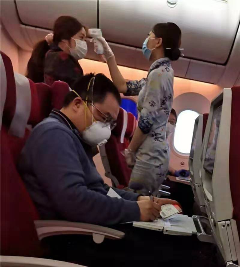 2月1日,在海南航空公司的國際航班上,機組人員向旅客發放健康申報表,并進行必要的健康檢測和消毒。中國民航嚴格有序的措施,確保國際間人員往來和目的地國家的健康安全。