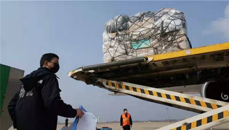 1月28日,工人在武漢天河國際機場卸貨。當日,武漢天河國際機場共有3架全貨機滿載醫療防疫物資抵港,包含醫用口罩、醫用帽子、乳膠手套、防護服、消毒液等各類防護用品及醫療藥品,共計60余噸。