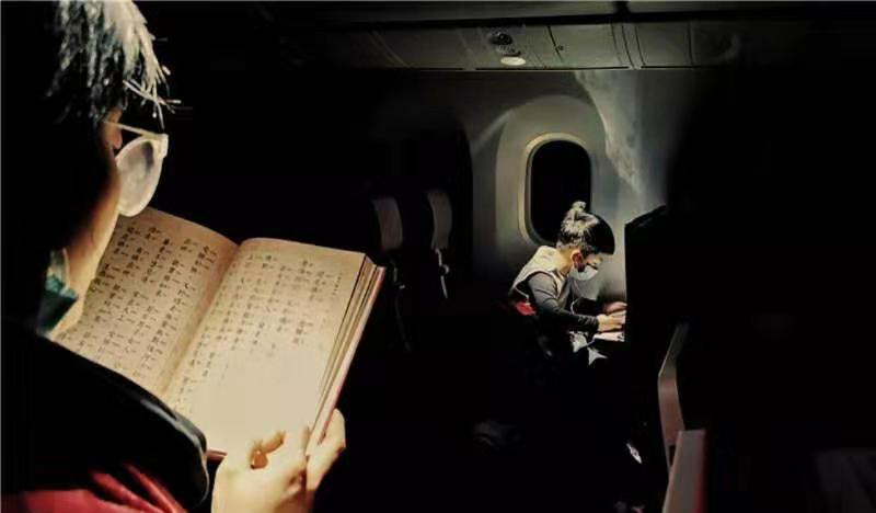 1月25日,由重慶起飛的航班上,兒子戴著口罩做作業。
