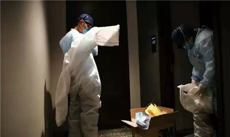 1月26日,上海一隔離點,醫療人員在穿防護服。