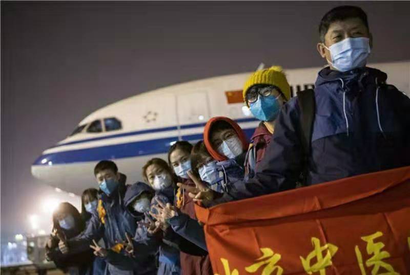 1月27日18時許,首都國際機場,北京市屬醫院援武漢醫療隊隊員合影。當日,這支醫療隊乘坐國航包機奔赴武漢,隊員136人全部來自北京市各三甲醫院。隨同醫療團隊一起登機的,還有武漢急需的醫療用品。