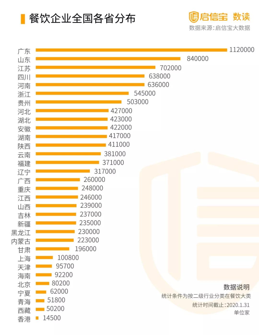 根據(jù)啟信寶數(shù)據(jù)統(tǒng)計(jì),全國(guó)共有11114300家有餐飲業(yè)務(wù)的企業(yè),其中廣東、山東、江蘇分別數(shù)量為前三,可能損失會(huì)相對(duì)較大。