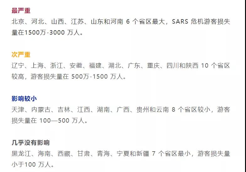 2003年SARS旅游業(yè)對(duì)不同地區(qū)造成不同級(jí)別的損失,北京、河北、山西、江蘇、山東和河南這6個(gè)省區(qū)最大。