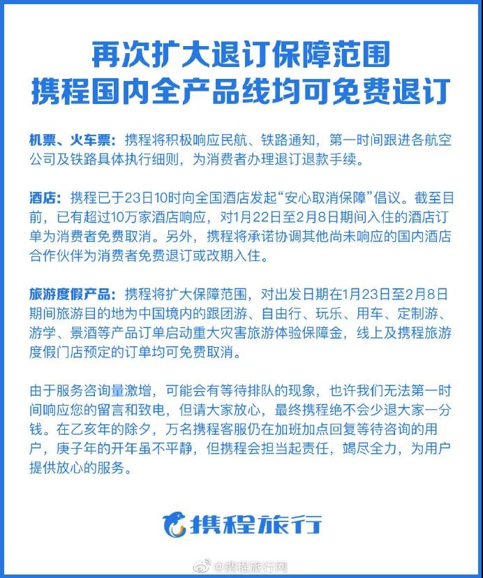 根據(jù)攜程1月31日晚間發(fā)布的“春運(yùn)退訂大數(shù)據(jù)”顯示,疫情發(fā)生以來(lái),截至1月30日,攜程客服收到的退改量為數(shù)百萬(wàn)單春節(jié)旅游訂單,客戶全球跟團(tuán)、半自助和定制游的訂單損失負(fù)擔(dān)至2月29日前。