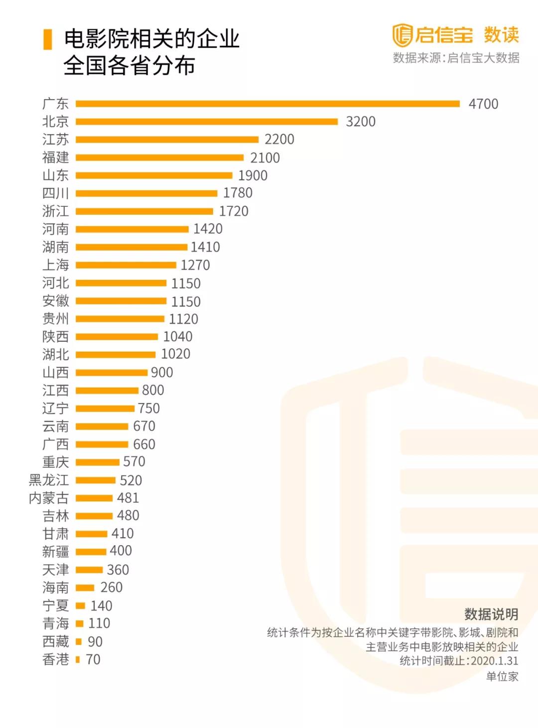 根據(jù)啟信寶數(shù)據(jù)統(tǒng)計(jì),全國(guó)共有36262家有影院業(yè)務(wù)的企業(yè),其中廣東、北京、江蘇分別數(shù)量為前三,可能損失會(huì)相對(duì)較大。