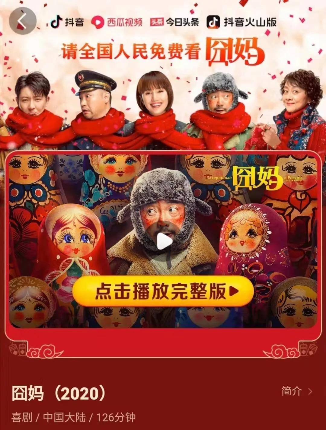 1月28日,字節(jié)跳動(dòng)對(duì)外宣布,截至1月27日零時(shí),電影《囧媽》在頭條系四大平臺(tái)(抖音、西瓜視頻、今日頭條、抖音火山版)及智能電視鮮時(shí)光三日總播放量超過(guò)6億,總觀看人次1.8億。統(tǒng)計(jì)顯示,2019年整個(gè)春節(jié)檔全部影片前三日的觀影人次為7378.1萬(wàn)。