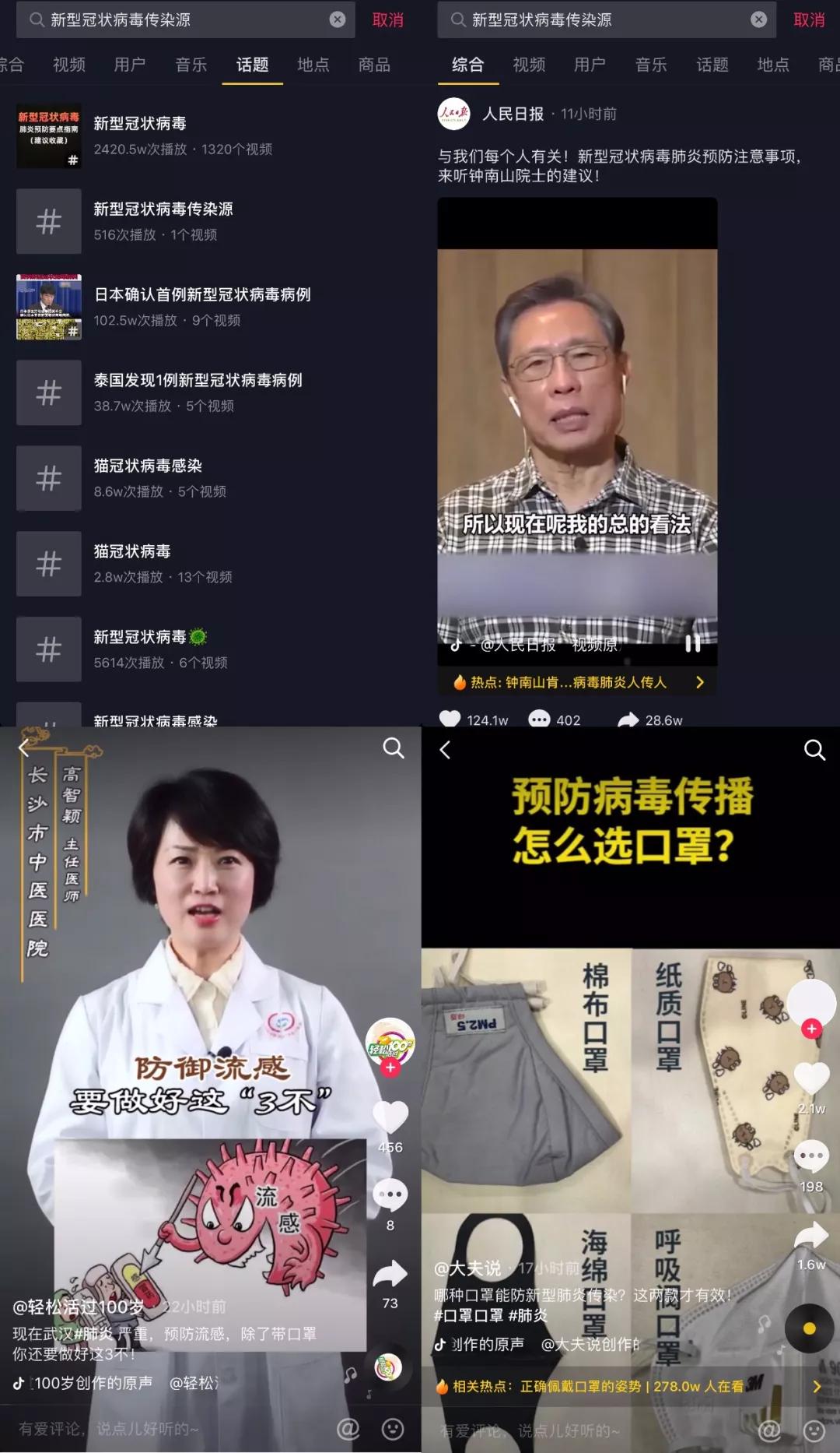 抖音關(guān)于“肺炎”的話題,也有8752.1萬(wàn)的播放量,底下也是官方媒體、醫(yī)療機(jī)構(gòu),或是素人賬號(hào)對(duì)這次肺炎病毒的自發(fā)性科普。