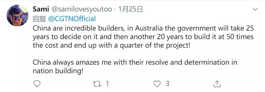 “中國(guó)真是令人難以置信的建設(shè)者,在澳大利亞,政府需要25年時(shí)間來(lái)做出決定,然后再用20年時(shí)間來(lái)建造,成本會(huì)是50倍,且最后僅以項(xiàng)目的四分之一完工!中國(guó)在國(guó)家建設(shè)方面的決心和果斷總是讓我吃驚!”