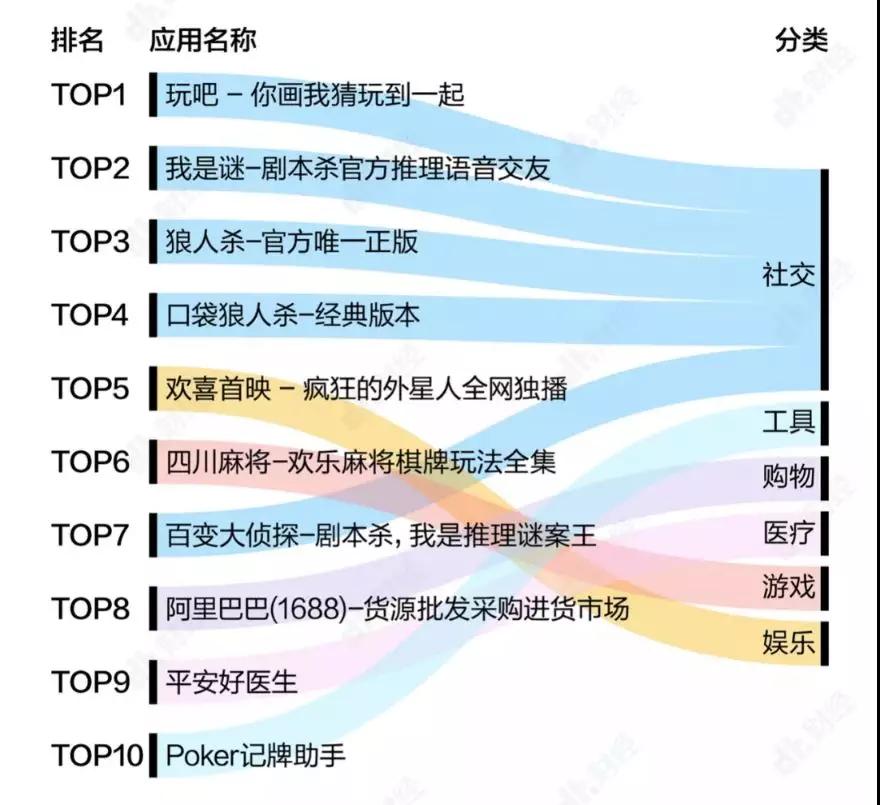 根據(jù)七麥數(shù)據(jù),近七天下載量上升最多的1000個(gè)APP中有超過(guò)40%是游戲類應(yīng)用。其中排名前四的是玩吧、我是謎、狼人殺、口袋狼人殺四個(gè)社交類游戲APP。