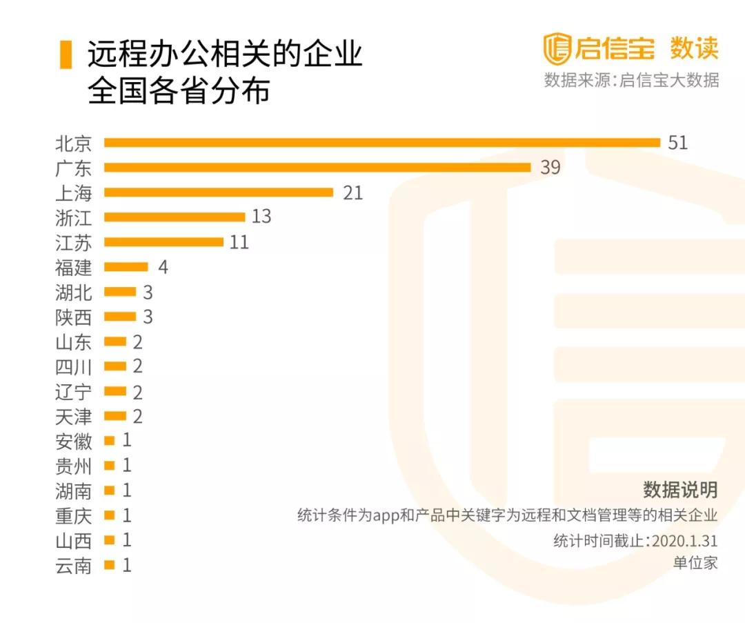 根據(jù)啟信寶數(shù)據(jù)統(tǒng)計(jì),全國(guó)共有159家有遠(yuǎn)程辦公的企業(yè),其中北京、廣東、上海分別數(shù)量為前三,可能受益會(huì)相對(duì)較大。