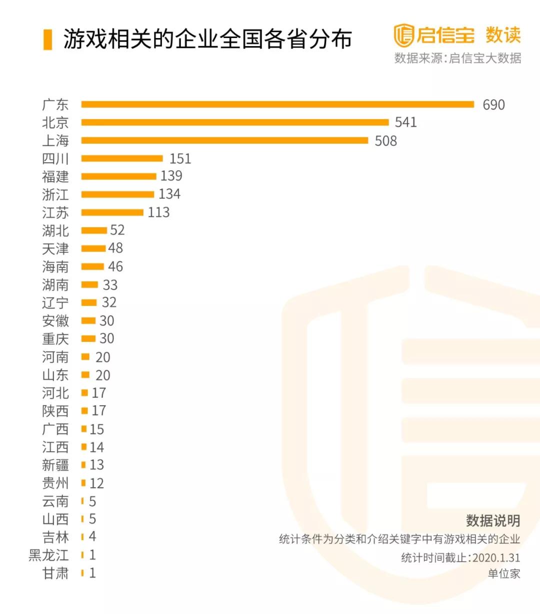 根據(jù)啟信寶數(shù)據(jù)統(tǒng)計(jì),全國(guó)共有2693家有游戲業(yè)務(wù)的企業(yè),其中廣東、北京、上海分別數(shù)量為前三,可能受益會(huì)相對(duì)較大。