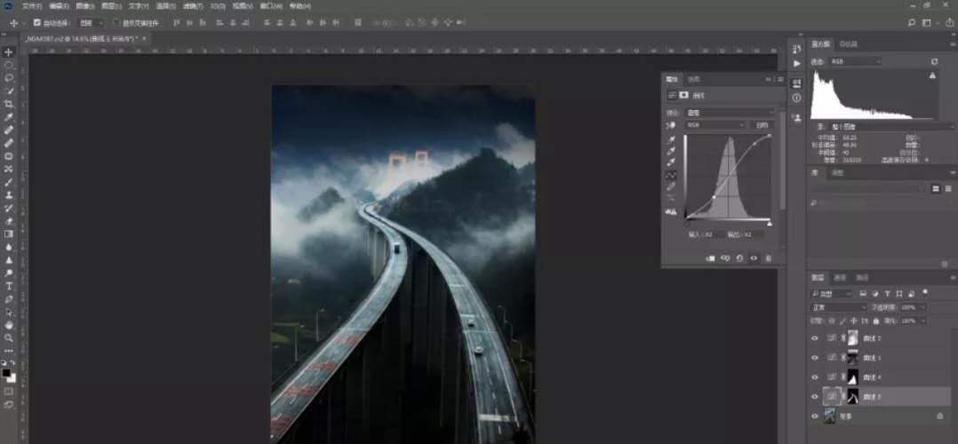 回到背景圖層,再選擇快速選擇工具(屬性中選擇添加選區)選擇兩條高速路執行曲線調整層工具,通過S型曲線調整加強高速路的反差,點擊曲線調整層蒙版滑動下羽化滑塊,稍微羽化選區。通過這一步驟調整目的是加強高速路的質感。