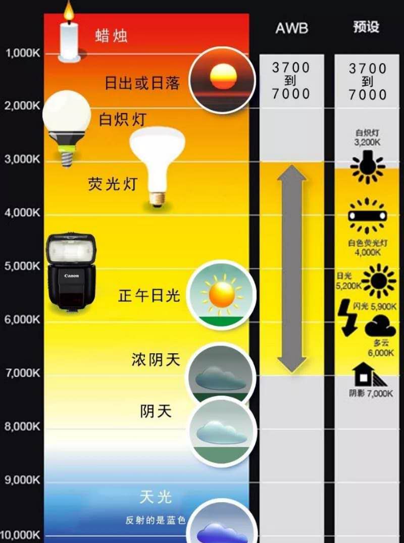 說到色溫一定要說說什么是白平衡,白平衡的概念涉及到色彩學的知識,作為初學者也不需要了解過深。只要明白白平衡是為了還原“白就是白”,也就是說使您的照片更趨于人的視覺習慣。比如,我們在白熾燈燈光的房間內拍攝人物,如果白平衡調整不好,就容易偏色,出現紅臉,設置適當的白平衡讓人臉看上去符合視覺習慣,這就是使用白平衡的體現。白平衡調整可以手動也可以自動(AWB),也可以通過后期Camera raw工具調整白平衡,也可以利用色溫進行藝術創作。
