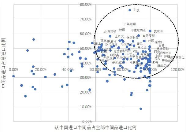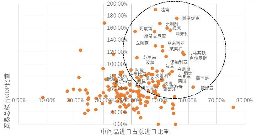 如圖所示,對國際貿(mào)易依賴程度更高、與國際供應鏈聯(lián)系更強、且從中國進口中間品較多的國家大多都是發(fā)展中國家,幾乎沒有發(fā)達經(jīng)濟體。當然,在部分產(chǎn)業(yè)中有些發(fā)達國家和中國在生產(chǎn)和消費環(huán)節(jié)的聯(lián)系非常緊密,如電子產(chǎn)業(yè)中以中日韓為核心形成了東亞生產(chǎn)體系,汽車產(chǎn)業(yè)中德國對中國的終端需求依賴度較高。