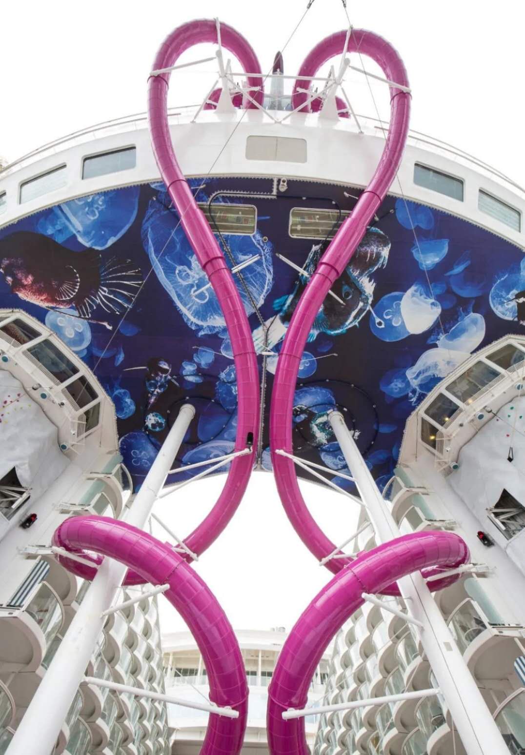 在海洋和諧號郵輪上,皇家加勒比首次出現(xiàn)的.終極深淵水上滑梯,游客可以從一個(gè)玻璃平臺(tái)上出發(fā),以每小時(shí)9英里的速度從10層甲板上滑下。提供一種多感官通道的滑梯體驗(yàn),包括自發(fā)的音響效果、定制的騎行墊、定制的制服和配件。該景點(diǎn)旨在刺激客人,同時(shí)保持一種心跳的期待感。終極深淵位于海之和諧號的尾部,高出海平面150英尺,有100英尺的落差。