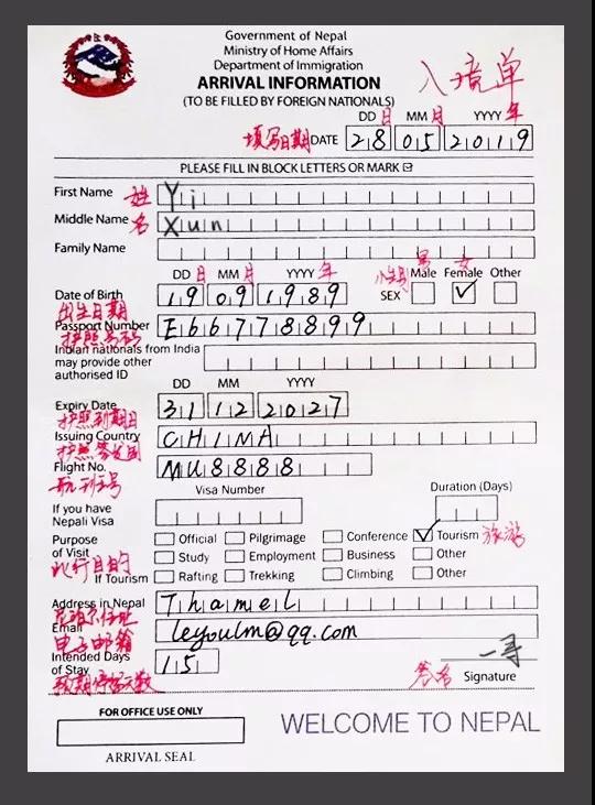 抵達加德滿都國際機場,進入航站大樓穿過走廊后,達到入境大廳。在桌子上,可以很容易找到入境卡。如果乘坐國內航空公司飛機入境,飛機快抵達時,空乘人員會給每位乘客分發一張入境卡,如果空乘沒有主動給,自己可以在飛機上向空乘人員索要入境卡。入境卡是每個人都務必填寫的,包括已辦理好簽證和準備辦理落地簽的游客。