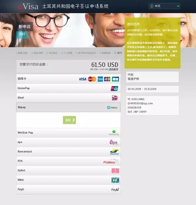 進(jìn)入付款頁(yè)面,支付61.5美元的費(fèi)用,其中60美元為簽證費(fèi),1.5美元為服務(wù)費(fèi)。