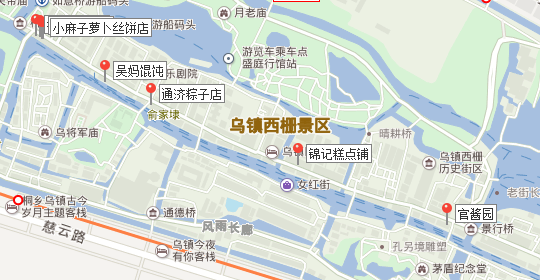 除了這些著名的餐廳之外,烏鎮(zhèn)的大部分特色糕點(diǎn)小吃也集中在西柵。比如擅長(zhǎng)各式糕點(diǎn)的錦記糕點(diǎn)鋪、滋啦啦油煎鋪內(nèi)的小麻子蘿卜絲餅店、專做各式粉圓的沈記粉圓店等等。具體位置也都在下圖中標(biāo)注出來了(小麻子蘿卜絲餅店附近的小吃鋪?zhàn)颖容^集中)。