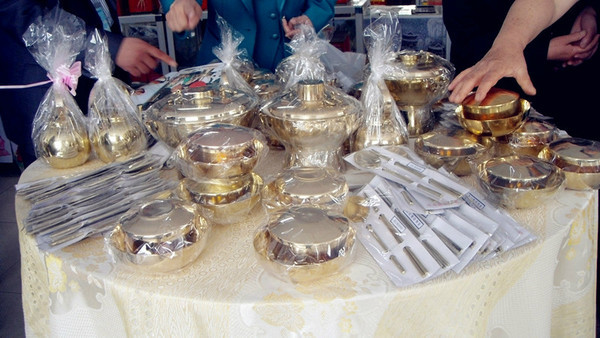 雖然朝鮮整體的生活水平不高,但在專對(duì)外國人開放的小賣部或者紀(jì)念品店,商品的價(jià)格并不低。朝鮮特色的純銅筷子(一雙)+勺子(一個(gè)),每套根據(jù)份量不同,有20元和25元人民幣兩種價(jià)格,一套銅碗260元人民幣,40度的高麗人參酒100元人民幣/瓶,一瓶朝鮮特色辣醬20元人民幣,一件紀(jì)念T恤100元人民幣。