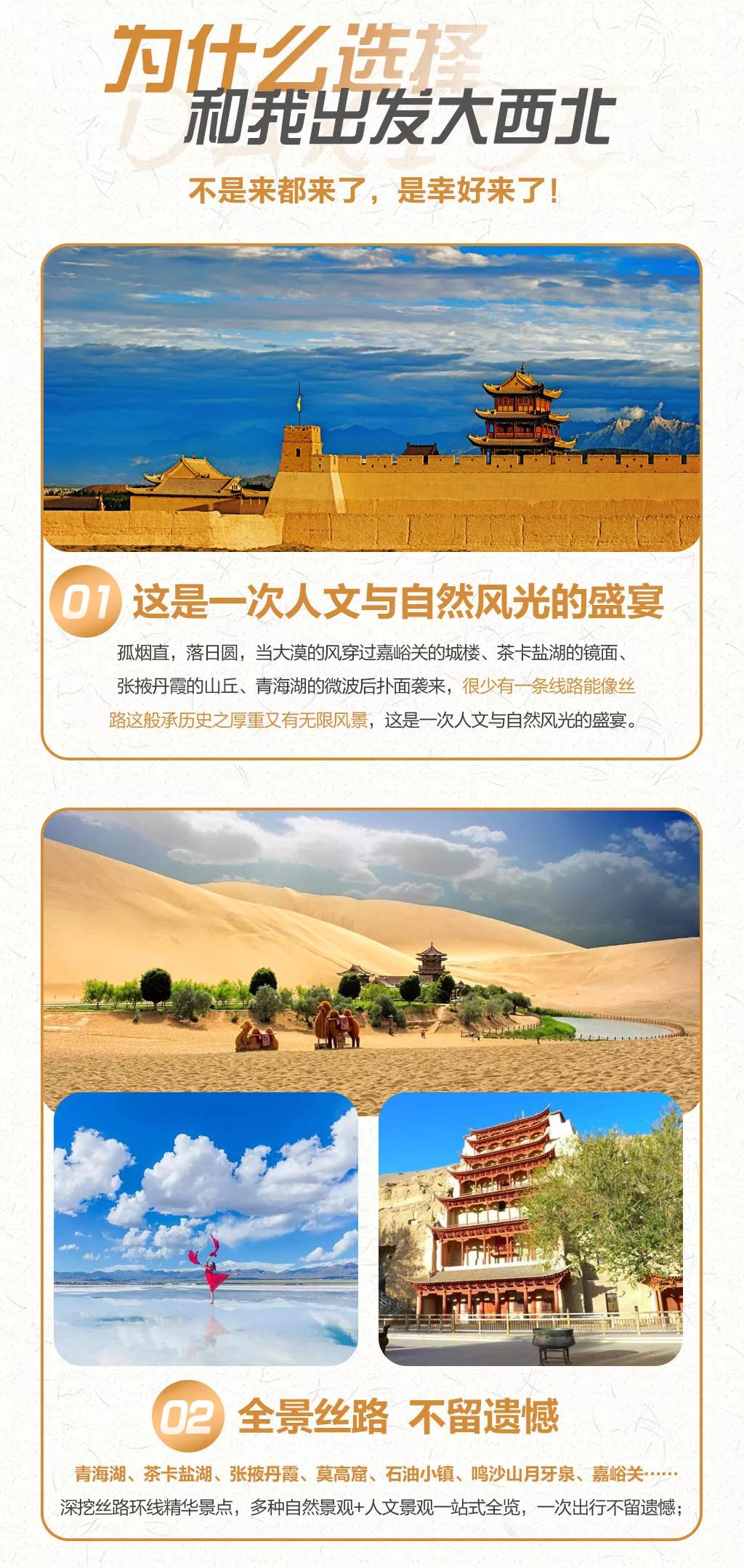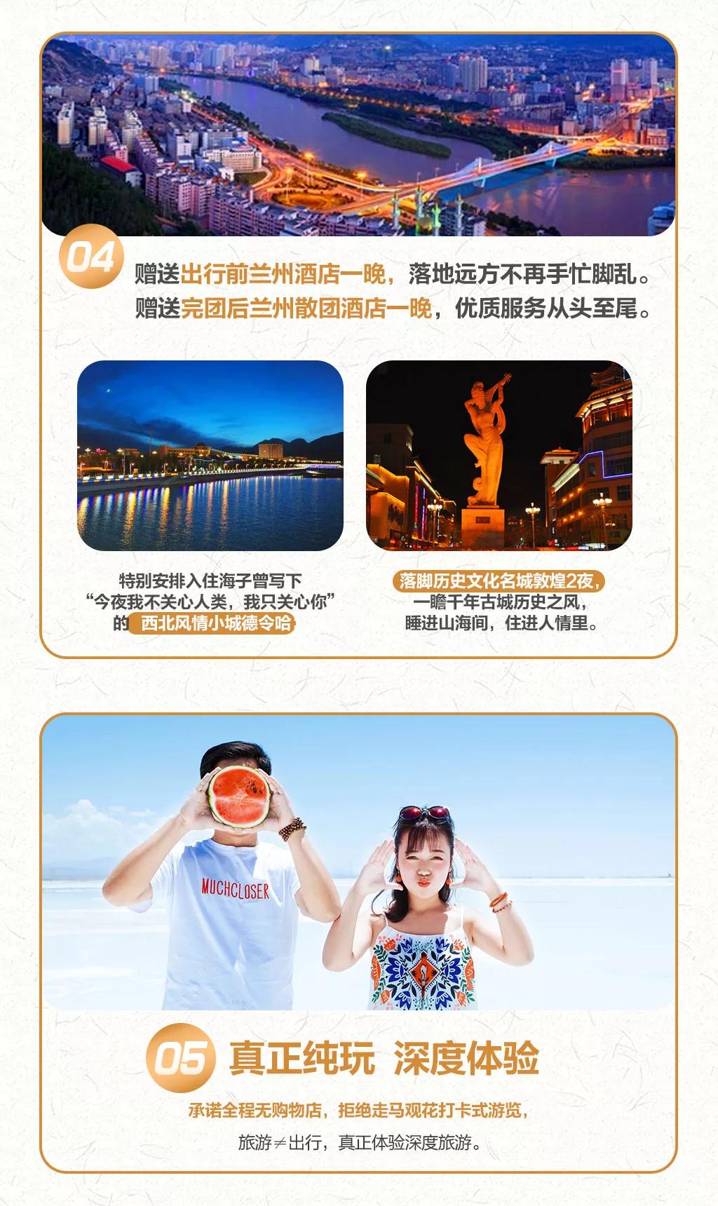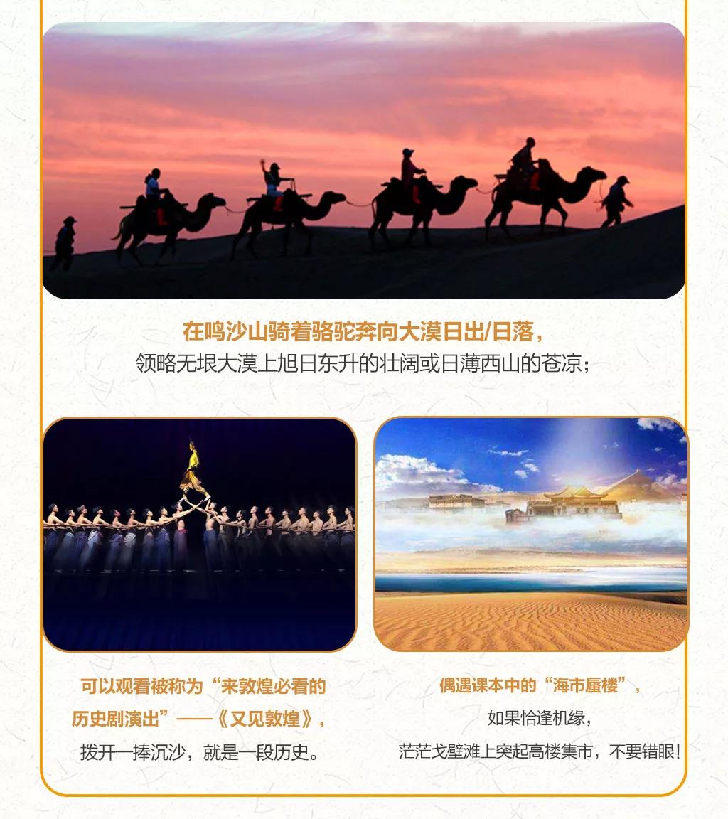 西北地區(qū)天氣干燥,旅途的過程中請大家多喝水,注意防曬;敦煌《又見敦煌》演出,旅游淡季298元/人,旺季368元/人起;果木烤全羊費(fèi)用根據(jù)羊的大小決定,由參與活動的游客均攤,一般10人一桌,人均消費(fèi)160元左右。