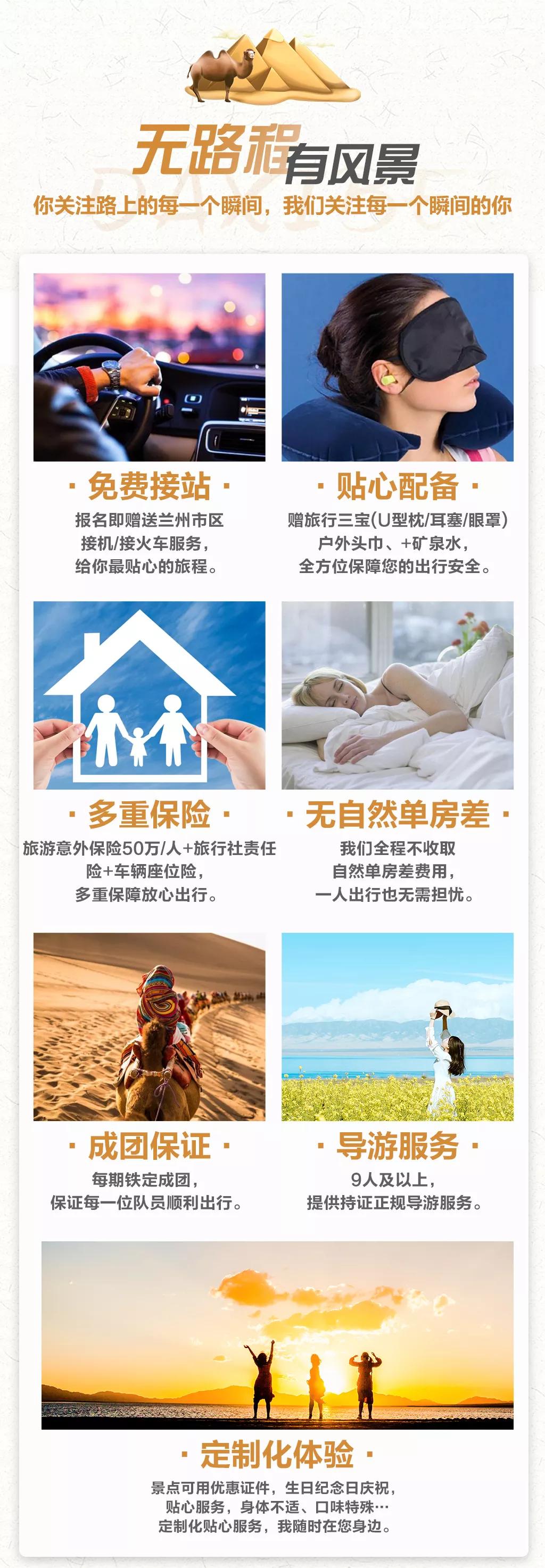 贈送:贈送特色敦煌沙漠BBQ;特贈獨(dú)家定制許愿瓶禮盒,許你獨(dú)家記憶;贈送貼心禮包旅游三寶、魔術(shù)頭巾、礦泉水;贈送蘭州市區(qū)接機(jī)/接火車服務(wù),23點(diǎn)后由于運(yùn)管規(guī)定不能接機(jī)/接站,敬請諒解。(贈送項(xiàng)目不用費(fèi)用不退)