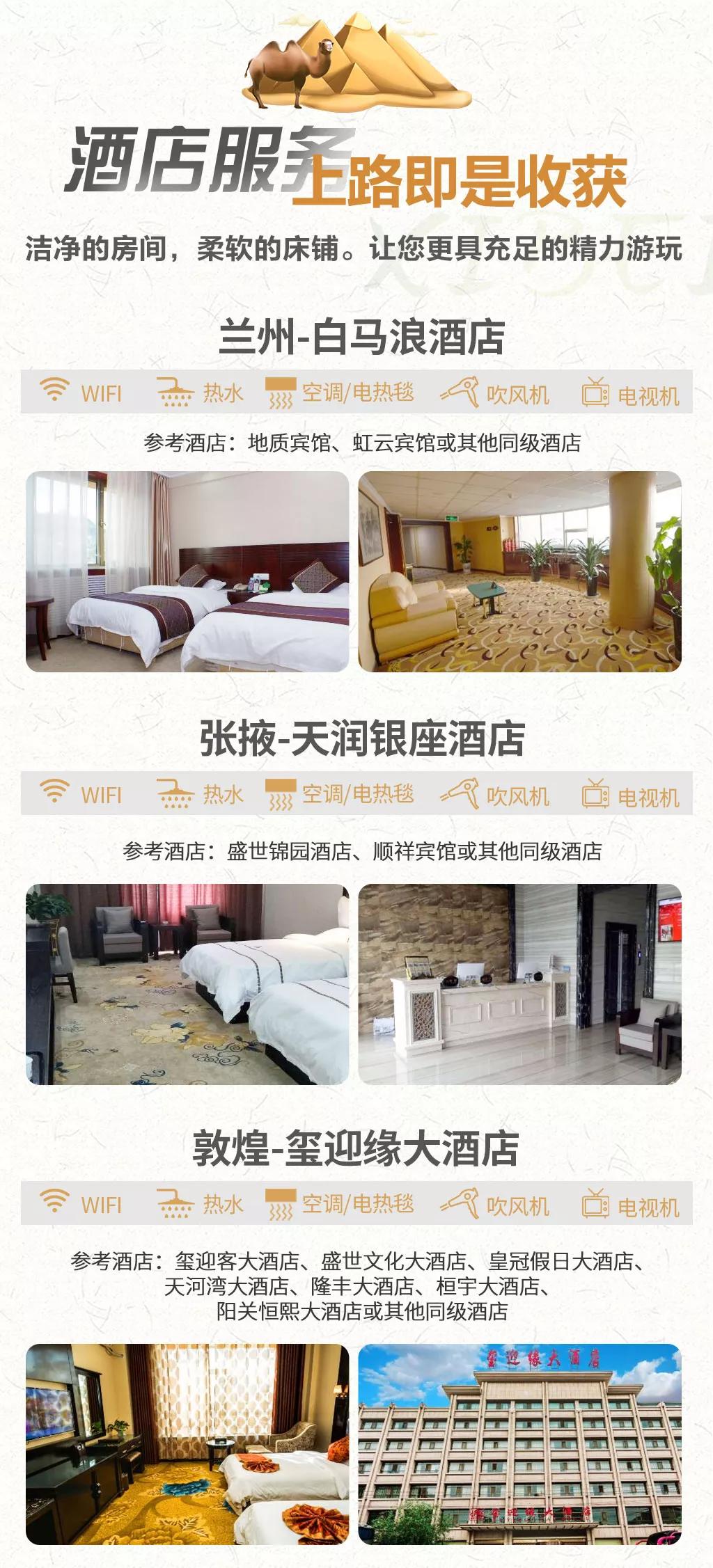 敦煌:璽迎緣大酒店、璽迎客大酒店、盛世文化大酒店、皇冠假日大酒店、天河灣大酒店、隆豐大酒店、桓宇大酒店、陽關(guān)恒熙大酒店或其他同級酒店
