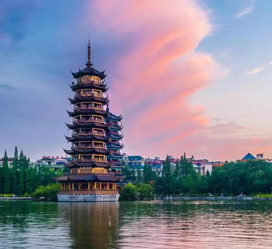 第四天:早集合出發,趕往【銀子巖景區】,【銀子巖溶洞】是典型的喀斯特地貌,貫穿十二座山峰,屬層樓式溶洞,洞內匯集了不同地質年代發育生長的鐘乳石,晶瑩剔透,潔白無瑕,宛如夜空的銀河傾斜而下,閃爍出像銀子、似鉆石的光芒。然后集合趕往【十里畫廊】,陽朔十里畫廊位于陽朔【月亮山】,因沿路風景秀麗,如詩如畫,被稱為陽朔十里畫廊。主要景觀有海豚出水、火焰山、龍角山、青厄風光、古榕美景等。十里畫廊游覽結束后趕往興坪,游覽【興坪古鎮】及【漓江】,興坪---漓江上一顆璀璨的明珠。境內不僅有九馬畫山、螺螄山、蓮花巖、天水寨、靈寶閣等八大景區、24個風景點讓人嘆為觀止,還有明代建筑騰蛟庵。從桂林至陽朔的83公里漓江河段,是漓江精華,除了【二十元人民幣背景】,還有“深潭、險灘、流泉、飛瀑”的佳景,是巖溶地形發育典型、豐富和集中地帶,集中了桂林山水的精華,令人有“舟行碧波上,人在畫中游”之感。游覽結束后趕往桂林。(入住桂林)