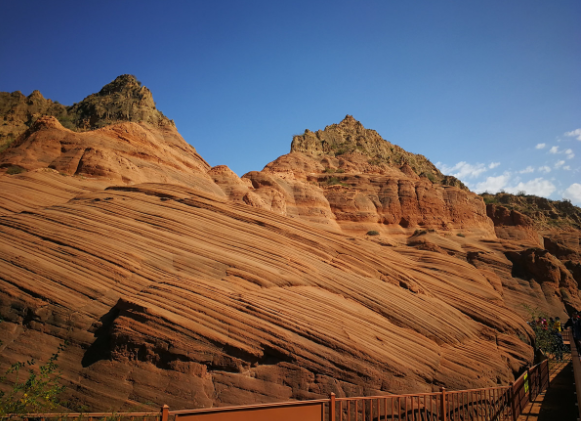 早餐后乘車約2.5小時150公里赴波浪谷景區(qū)走進(jìn)被譽為中國最美的【波浪谷】自理項目電瓶車50元,一起去感受大自然的鬼斧神工。龍洲紅砂巖位于靖邊縣龍州鄉(xiāng),是由紅色的砂巖構(gòu)成的特殊丹霞地貌,在長期的風(fēng)力和雨水的沖刷下形成溝壑、波浪起伏的山丘狀,因砂巖上的紋路像波浪,人稱“波浪谷”。遠(yuǎn)遠(yuǎn)望去,這些紅色石頭就像泥石流一樣呈現(xiàn)出一種流水狀,一圈圈、一彎彎的向溝壑中涌去,好像滔滔的黃河,洶涌奔騰,也有人把這里譽為”中國的科羅拉多”。靖邊波浪谷巖石學(xué)術(shù)上被稱為“砒砂巖”,成于古生代二疊紀(jì)和中生代三疊紀(jì)、侏羅紀(jì)、白堊紀(jì)之間。這是地球歷史中地質(zhì)最活躍、生物最繁茂、動物最龐大的時代。砒砂巖像綻放的罌粟花般美麗,壯觀,誘人,無水堅硬如石,遇水松軟如泥。