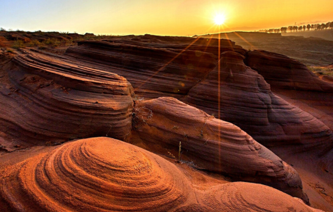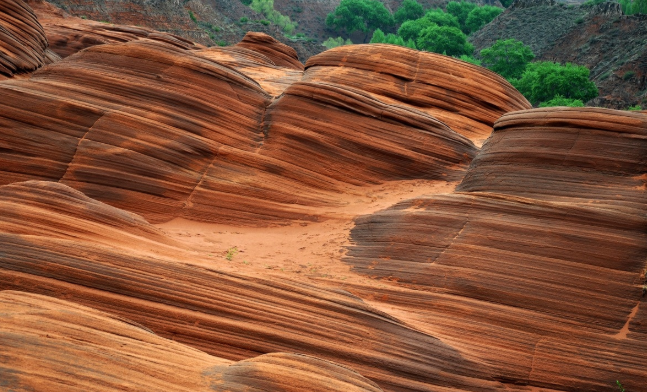 波浪谷展示的是由數(shù)百萬年的風(fēng)、水和時間雕琢砂巖而成的奇妙世界。層層疊疊的石頭就像一大批鋪蓋在地面上浸染過后晾曬的紅色布匹,一層層、一卷卷、一盤盤在夕陽的渲染之下,異常的鮮紅; 與溝底一處處流淌細(xì)小的河水和遠(yuǎn)處覆滿綠色植被山頂上轉(zhuǎn)動的風(fēng)車構(gòu)成了一幅優(yōu)美的實景畫。