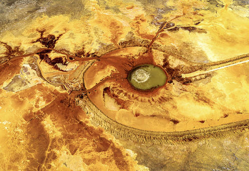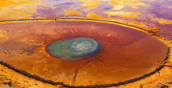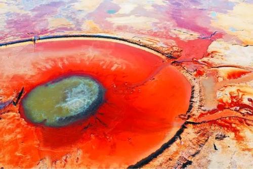 隨后我們前往阿拉爾草原深處去探索一方汩汩噴涌了上千年的地熱噴泉——【“惡魔之眼”艾肯泉】。“艾肯”在蒙語中意為“可怕”,而“艾肯泉”在蒙語中又意為“源頭”,因其湖水成分艾肯泉周圍寸草不生且形成了一個紅褐色的圓形,正中央便是汩汩而出的泉水,這便形成了一個巨大的“眼睛”,被人稱為“大地之眼”。從空中俯瞰航拍,這巨大的眼睛脈絡清晰,栩栩如生,在它周圍點綴著許多青色的小泉眼,神秘而震撼;除了其令人驚奇的血色眼睛造型,艾肯泉還有神奇的“喊泉”屬性,據說站在岸邊朝它大喊,或者是在岸邊跺跺腳,噴泉口的水流量就會加大,會噴涌得更高。