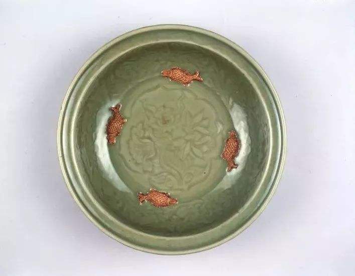 此洗敞口,折沿,圈足。洗心內塑貼兩條游魚,外壁刻凸菊瓣紋一周??谘貎蓚雀饔袃蓚€穿孔,相互對應,可用于穿飾金屬提環,以便于提攜。此器釉色青翠,塑貼魚紋清晰,是南宋龍泉窯的典型作品。在韓國新安海底沉船中亦發現有類似器物。