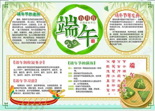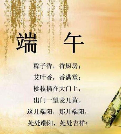 “棕子香,香廚房;艾葉香,香滿堂;桃枝插在大門上,出門一望麥兒黃;這兒端陽,那兒端陽,處處都端陽。”這首童謠所唱的便是中國的傳統(tǒng)節(jié)日"端午節(jié)”。