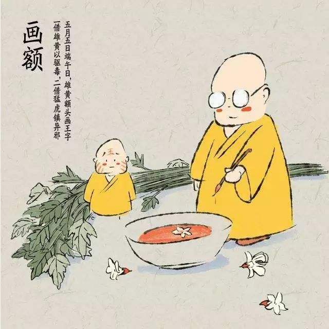 端午節(jié)時(shí)以雄黃涂抹小兒額頭的習(xí)俗,云可驅(qū)避毒蟲。典型的方法是用雄黃酒在小兒額頭畫“王”字,一借雄黃以驅(qū)毒,二借猛虎(“王”似虎的額紋,又虎為獸中之王,因以代虎)以鎮(zhèn)邪。除在額頭、鼻耳涂抹外,亦可涂抹他處,用意一致。山西《河曲縣志》云:“端午,飲雄黃酒,用涂小兒額及兩手、足心,……謂可卻病延年。”