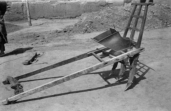 簍。由牲畜牽引,后面有人把扶,用來完成開溝和播種兩項工作,這種農具在東北使用比較普遍,它也是現代播種機的前身