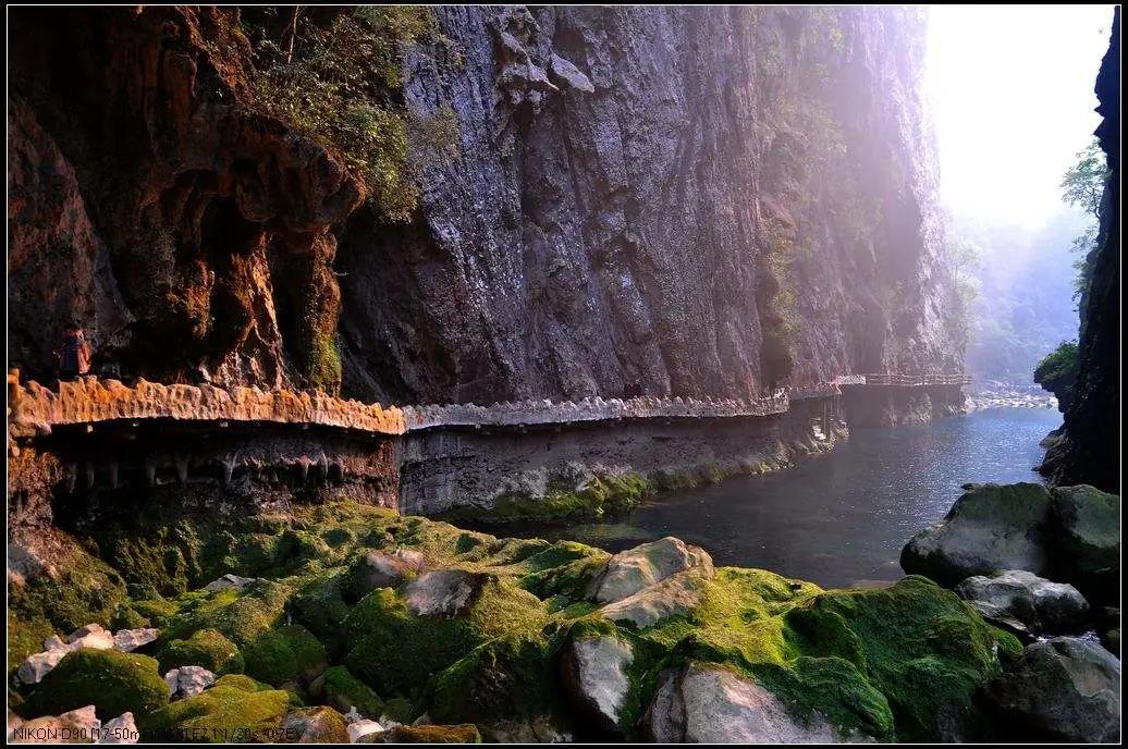 下午:后乘車前往游覽國家AAAAA級景區【大七孔】(游玩時間不少于2小時);大七孔是以原始森林、峽谷、伏流、地下湖為主體的景區,沿著恐怖峽打狗河直下,可見吊橋,右邊的棧道一面靠山,一邊臨水,蜿蜒曲折,凹凸不平。最為震撼的還是走過棧道的三分之二處,有一橫跨河兩岸的天然巨巖,是喀斯特是貌奇觀之一,俗稱天生橋,被專家們譽為“大自然神力所塑的東方凱旋門”,仰觀橋孔下,只見巨型鐘乳懸掛,橋腳、橋側的裂隙石縫長出綠石草叢灌木,藤蘿花卉纏裹橋身,真是滿目琳瑯、五顏六色的天然大彩橋。